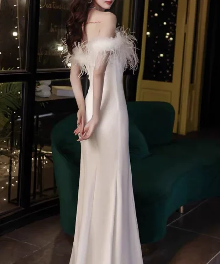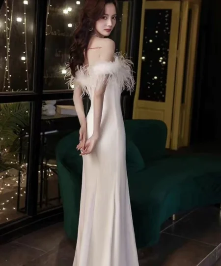 This elegant off-shoulder feather gown is designed for premium evening events, featuring a smooth spandex blend that offers a flattering, body-hugging silhouette. The soft feather trim adds a luxurious touch, making it perfect for parties, proms, weddings, and formal occasions. Available in multiple sizes and colors, this long dress delivers comfort, style, and timeless elegance.