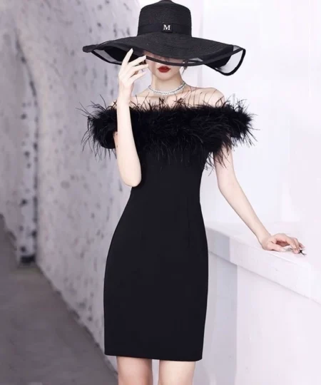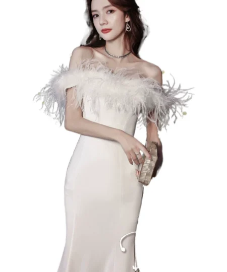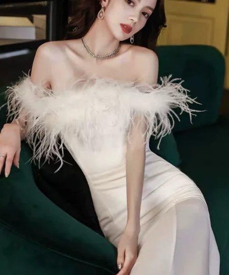 Titannorthamerica Luxury Feather Trim Off-Shoulder Dress for Women