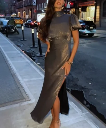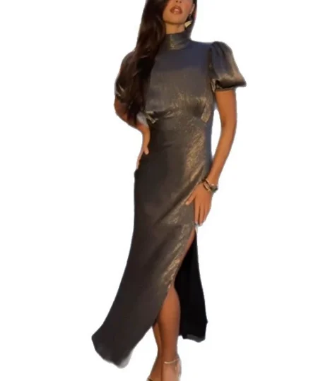 A shimmering bodycon maxi dress designed with short bubble sleeves, a fitted waist, and a stylish high collar. Crafted from high-quality polyester with a soft stretch finish, it enhances your figure while offering all-day comfort. Ideal for celebrations, formal nights, and upscale gatherings.